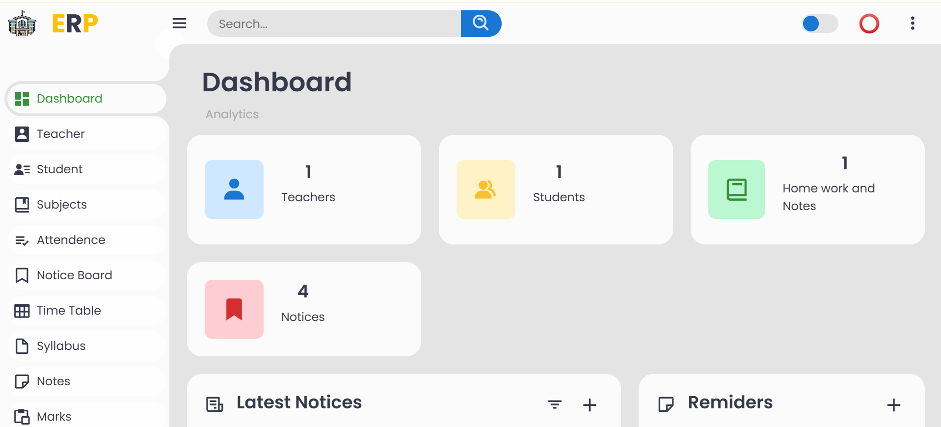 The Student Dashboard in an ERP-based school management system serves as a central hub for students to access academic information, track progress, and manage daily activities. It provides a user-friendly interface that enhances engagement, simplifies learning management, and ensures seamless communication between students, teachers, and administrators.
