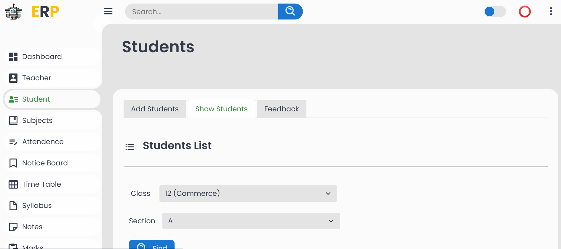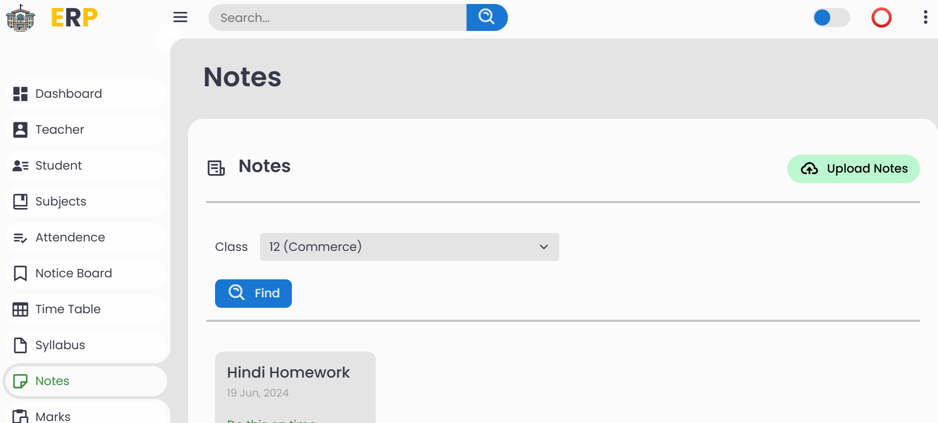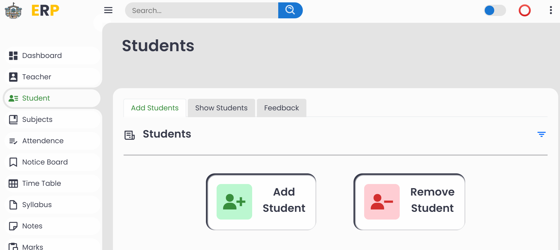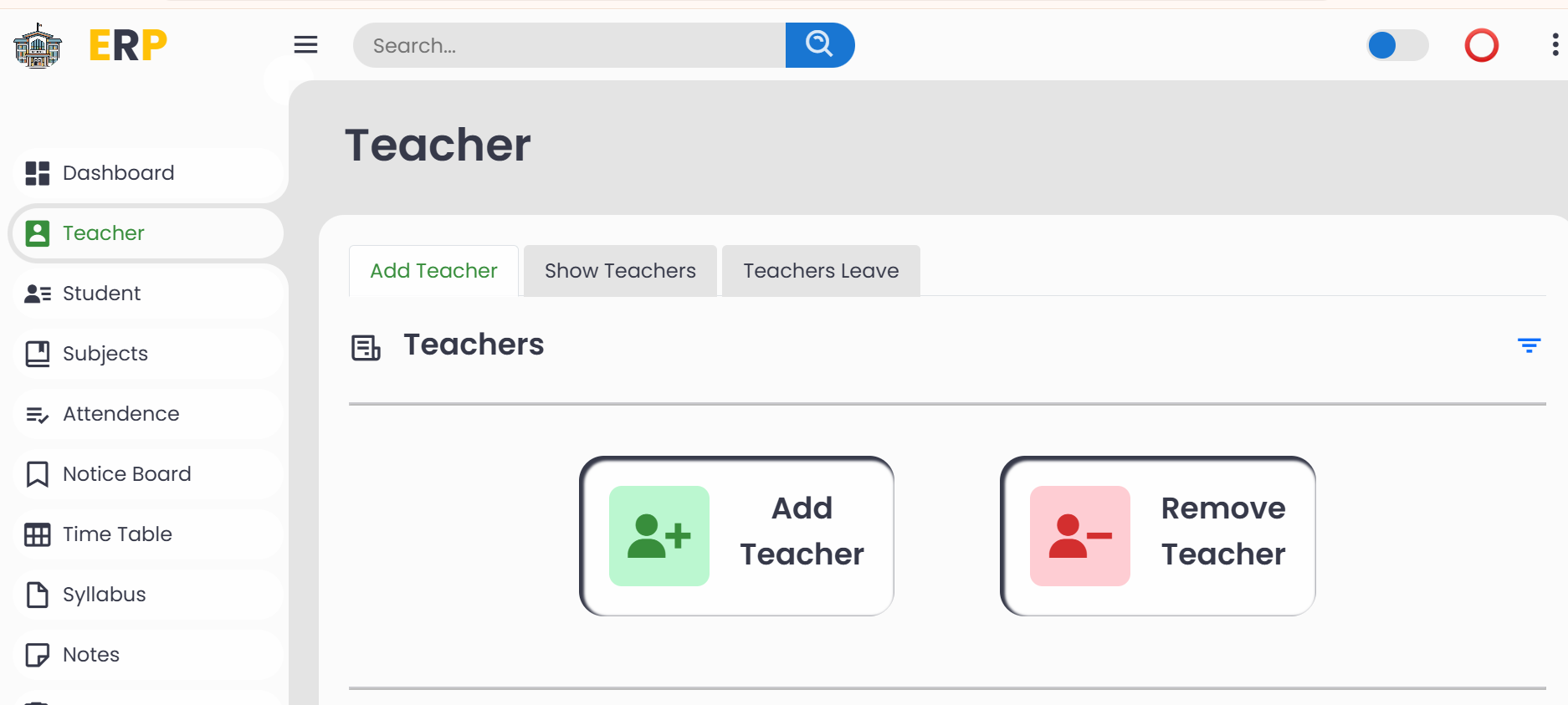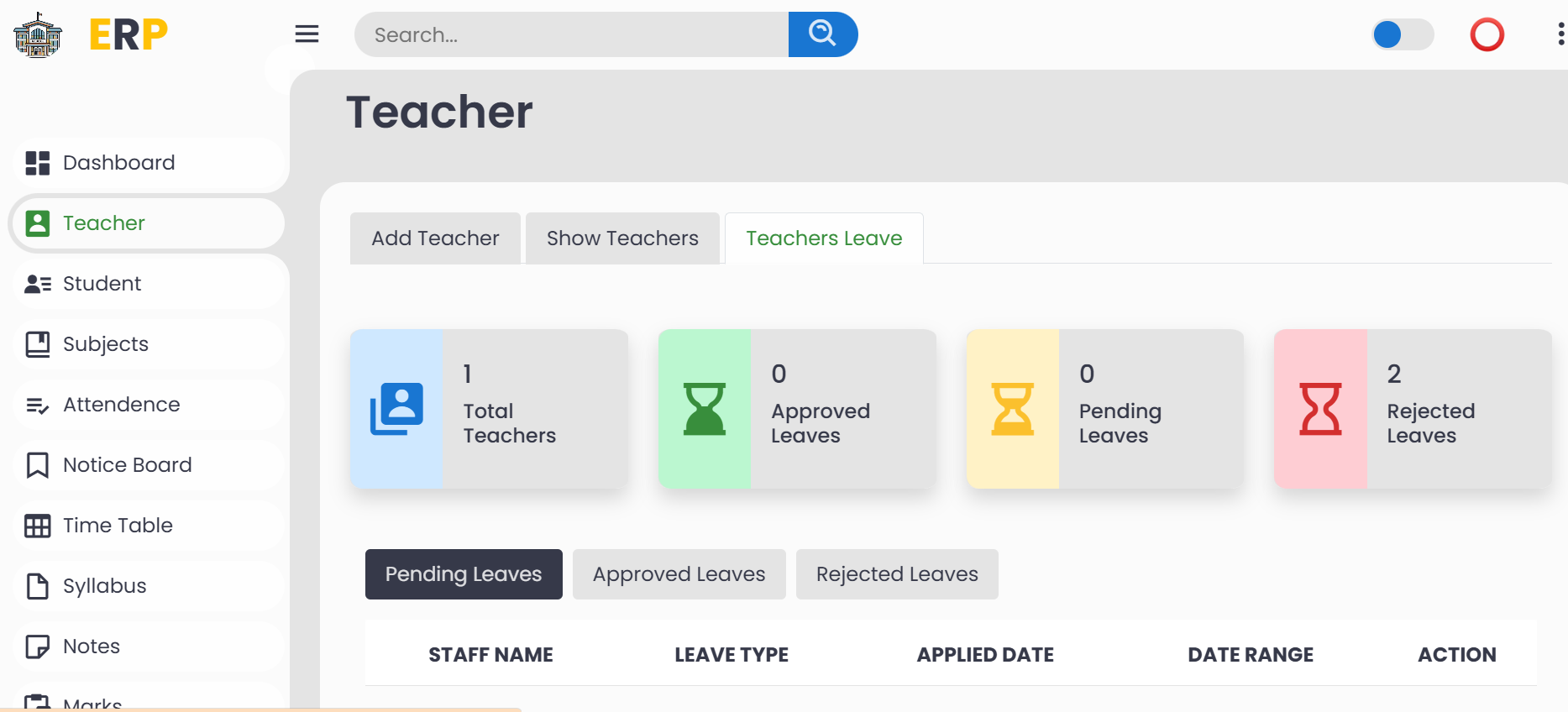 The Teacher Management Dashboard in this ERP system streamlines teacher leave approvals, attendance tracking, and administrative controls. It provides an organized, user-friendly interface for managing educators efficiently, helping administrators track teacher availability, manage leaves, and maintain accurate records. The dashboard also enables seamless communication between teachers and management through real-time updates and notifications.